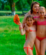 На изображении изображена молодая девочка с коротким светлым волосом, которая сидит на травянистой местности на берегу. Она одета в яркий купальник с узором из разноцветных бабочек. Купальник состоит из лифчика и низких шорт, оба элемента выполнены в насыщенных оранжево-зеленых цветах с бабочками различных цветов.